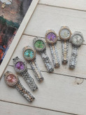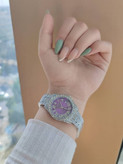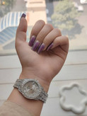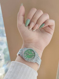 بارزترین ویژگی این مدل، طراحی پرنگین آن است. نگینهای کار شده روی قاب و صفحه، جلوهای خیرهکننده به ساعت بخشیدهاند و آن را به یک اکسسوری درخشان برای مجالس و موقعیتهای رسمی تبدیل کردهاند. بند و قاب از استیل براق و ضد زنگ ساخته شدهاند که علاوه بر مقاومت بالا، به ظاهر ساعت حس شیک و حرفهای میدهند.
