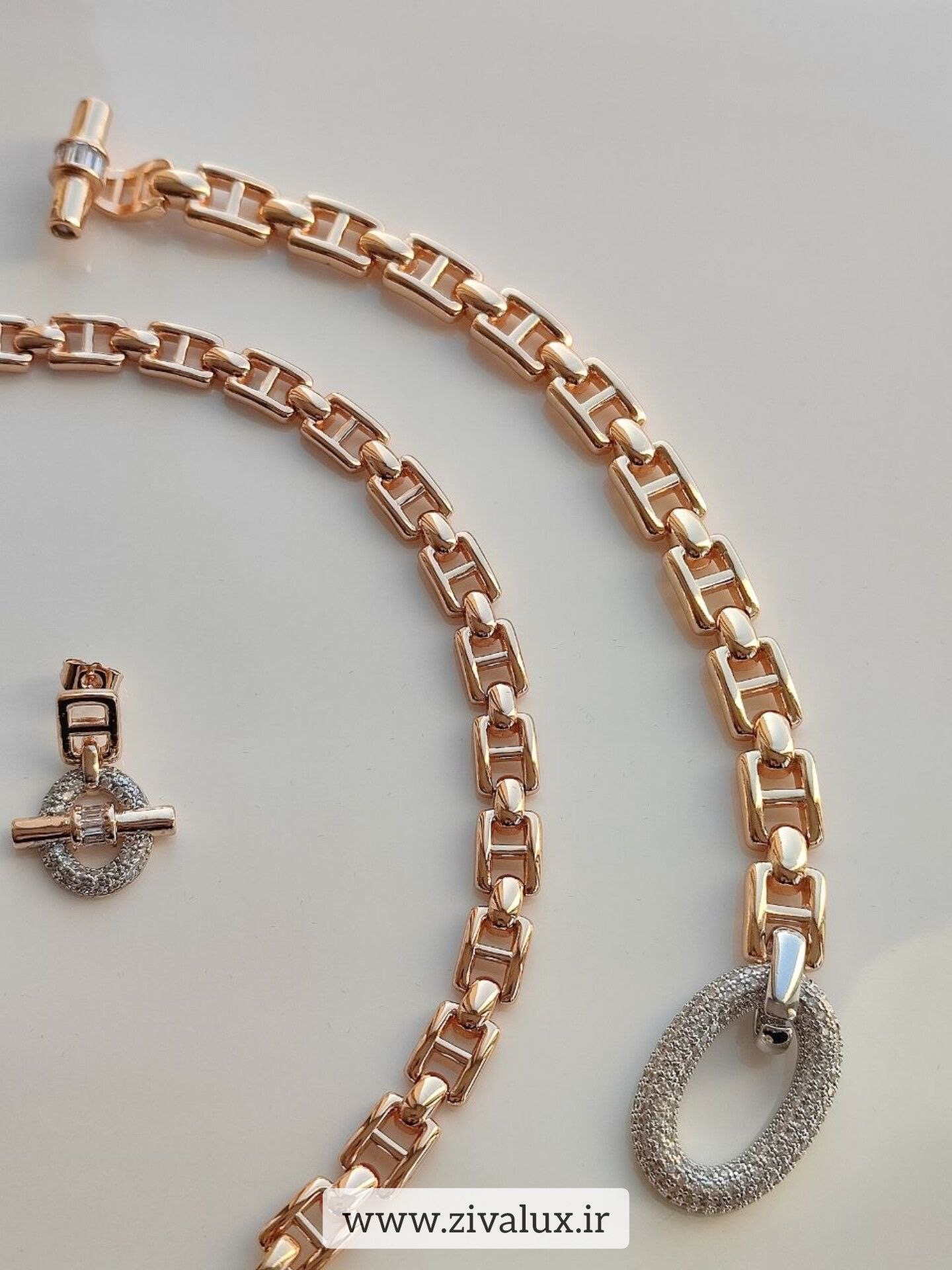 طراحی زنجیرها با بافتی منظم و فرم خاص، باعث شده این سرویس در عین سادگی، فوقالعاده جذاب و خاص به نظر برسد. ترکیب طلای زرد و سفید براق نیز به آن جلوهای چندبعدی و خاص بخشیده است ✨