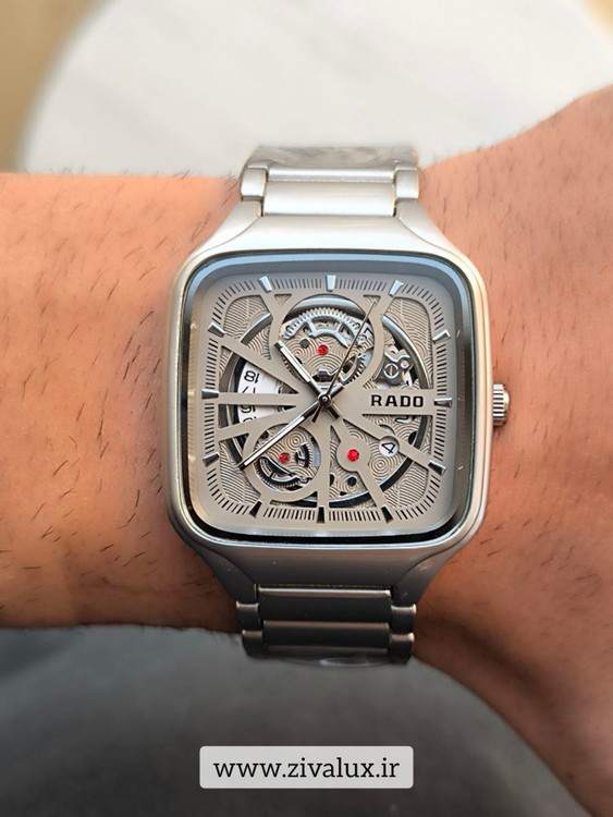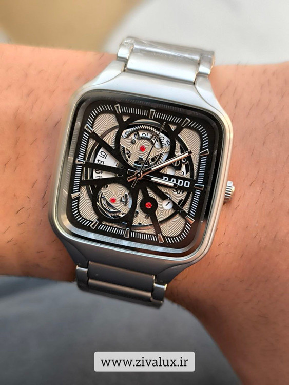 ساعت مردانه رادو (RADO) در نگاه اول، با طراحی مربعشکل و صفحهی اسکلتون (نمایان از داخل) دل هر سلیقهی لوکسپسندی را میبرد. ترکیب فرم صنعتی با ظرافت خطوط کلاسیک، جلوهای منحصربهفرد به این مدل داده است.