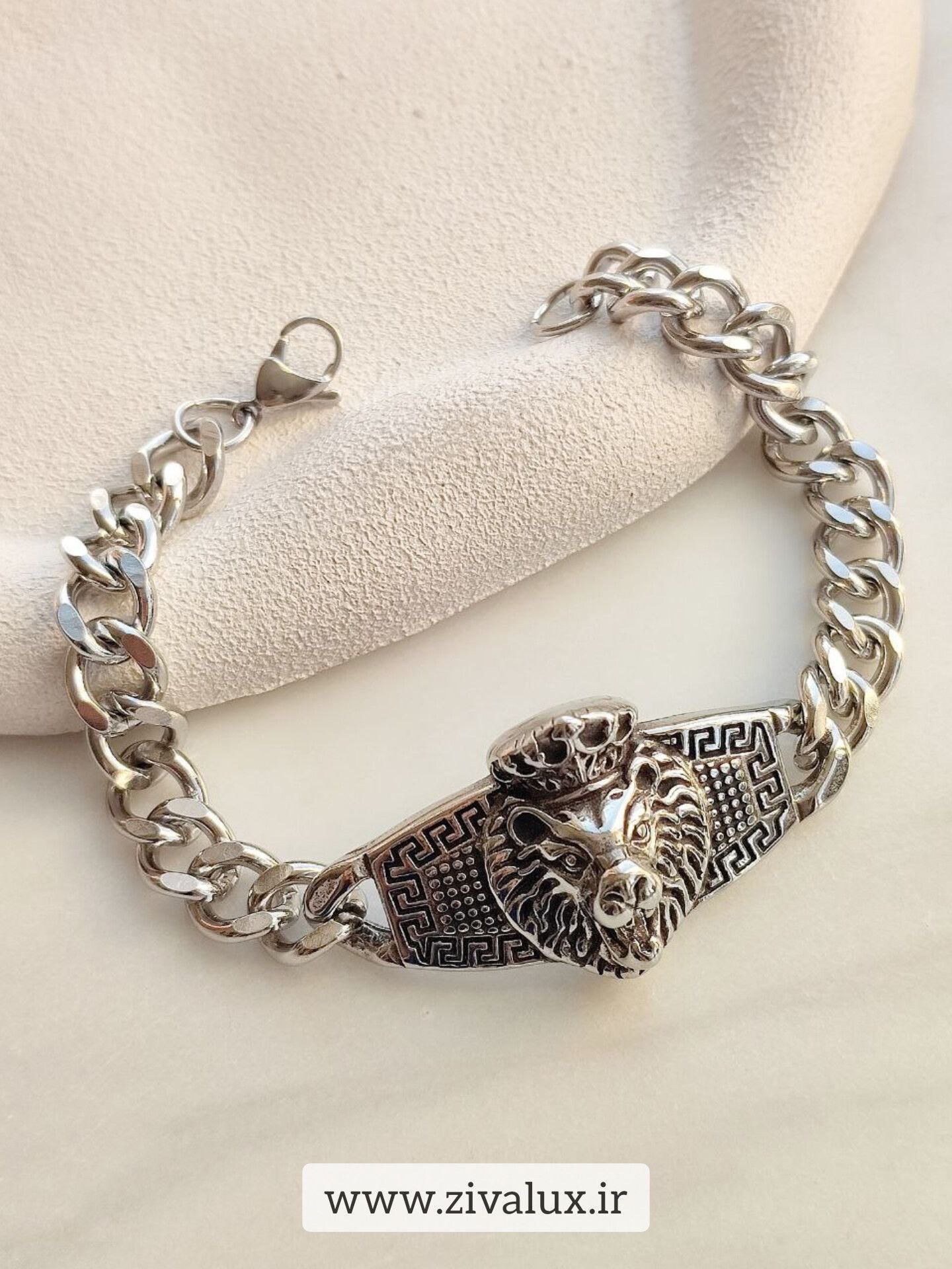 🔍 نقد و بررسی دستبند استیل شیر سلطنتی – نقرهای با بند کارتیر