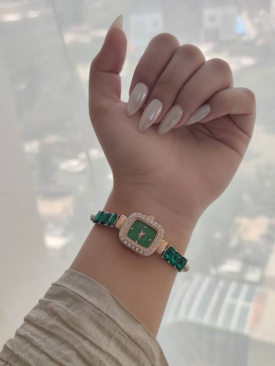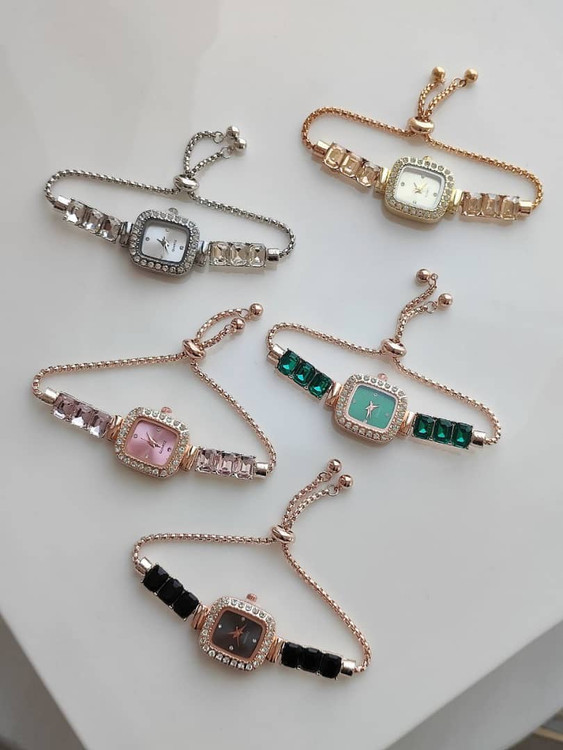 قاب مربعی شکل با حاشیهای پوشیده از نگینهای درخشان، جلوهای فاخر و چشمگیر ایجاد کرده است. بند ساعت به صورت دستبندی طراحی شده و با سنگها یا کریستالهای رنگی تزیین شده که در کنار هم حس یک اکسسوری گرانبها را منتقل میکند. سیستم قفل کشویی قابل تنظیم، علاوه بر راحتی، باعث میشود ساعت بهطور کامل با سایز مچ شما فیت شود.