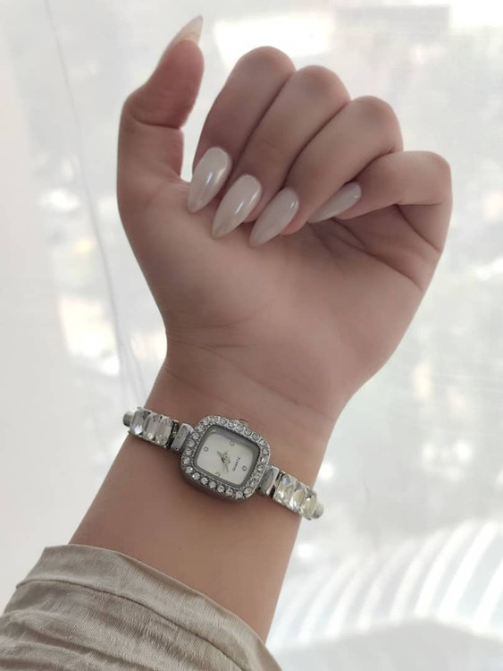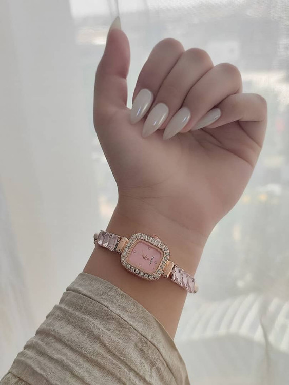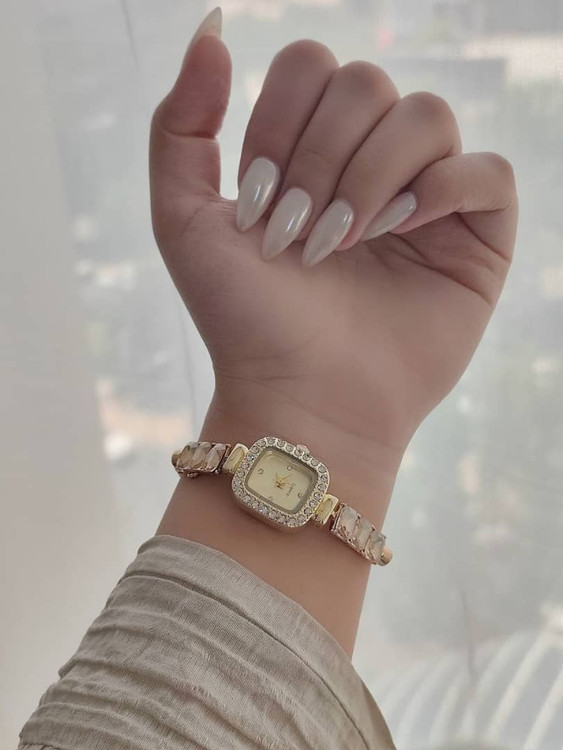 طراحی ظریف و لوکس: قاب ساعت مربعی شکل بوده و دور تا دور آن با نگینهای ریز و براق کار شده است که جلوهای شبیه به جواهرات دارد.