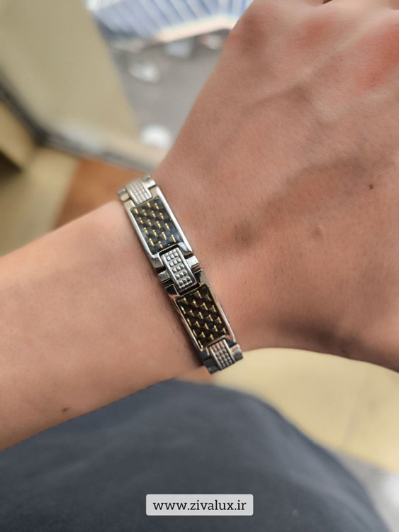 این دستبند با ترکیب استیل نقرهای براق و طرح مشبک مشکی با خطوط طلایی، یک هارمونی چشمنواز ایجاد کرده است. طراحی آن نهتنها مردانه و قدرتمند است، بلکه از ظرافت بالایی برخوردار بوده و کاملاً مناسب آقایانی است که به جزئیات اهمیت میدهند.