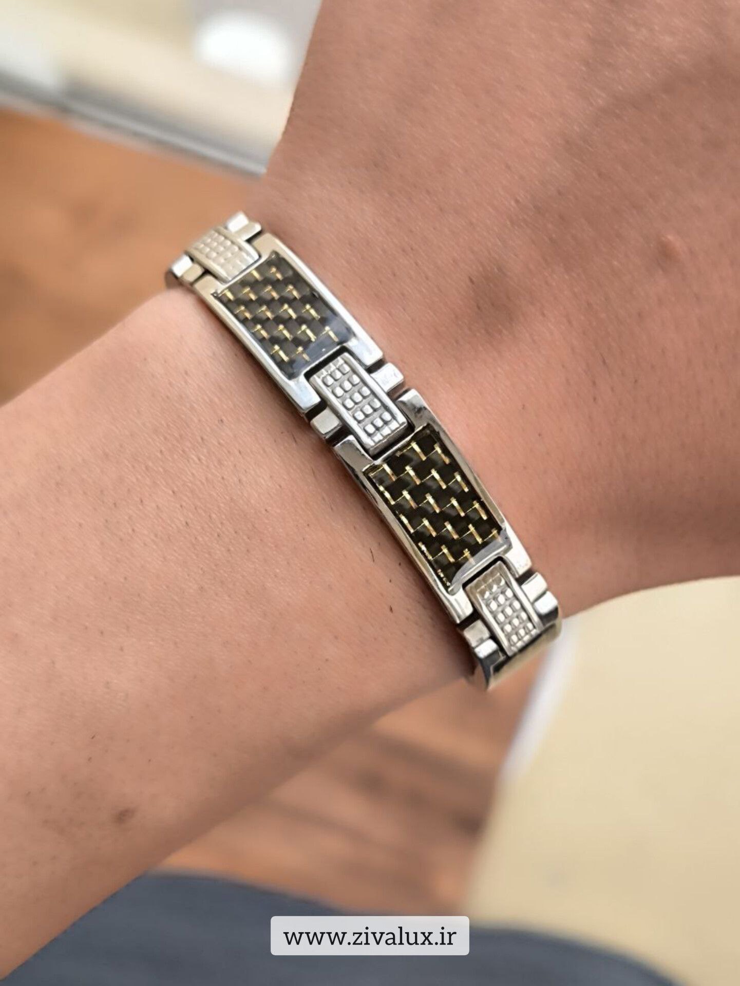 بافت طلایی ظریف، تضاد رنگی زیبا و فرم مردانه، باعث شده این دستبند یکی از محبوبترین مدلها برای استایلهای جذاب و جسورانه باشد.