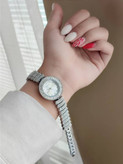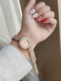 این ساعت با قاب گرد و ردیف نگینهای درخشان در دور صفحه و روی بند، ظاهری خیرهکننده دارد. در نگاه اول بیشتر شبیه یک دستبند جواهر است تا یک ساعت کلاسیک.