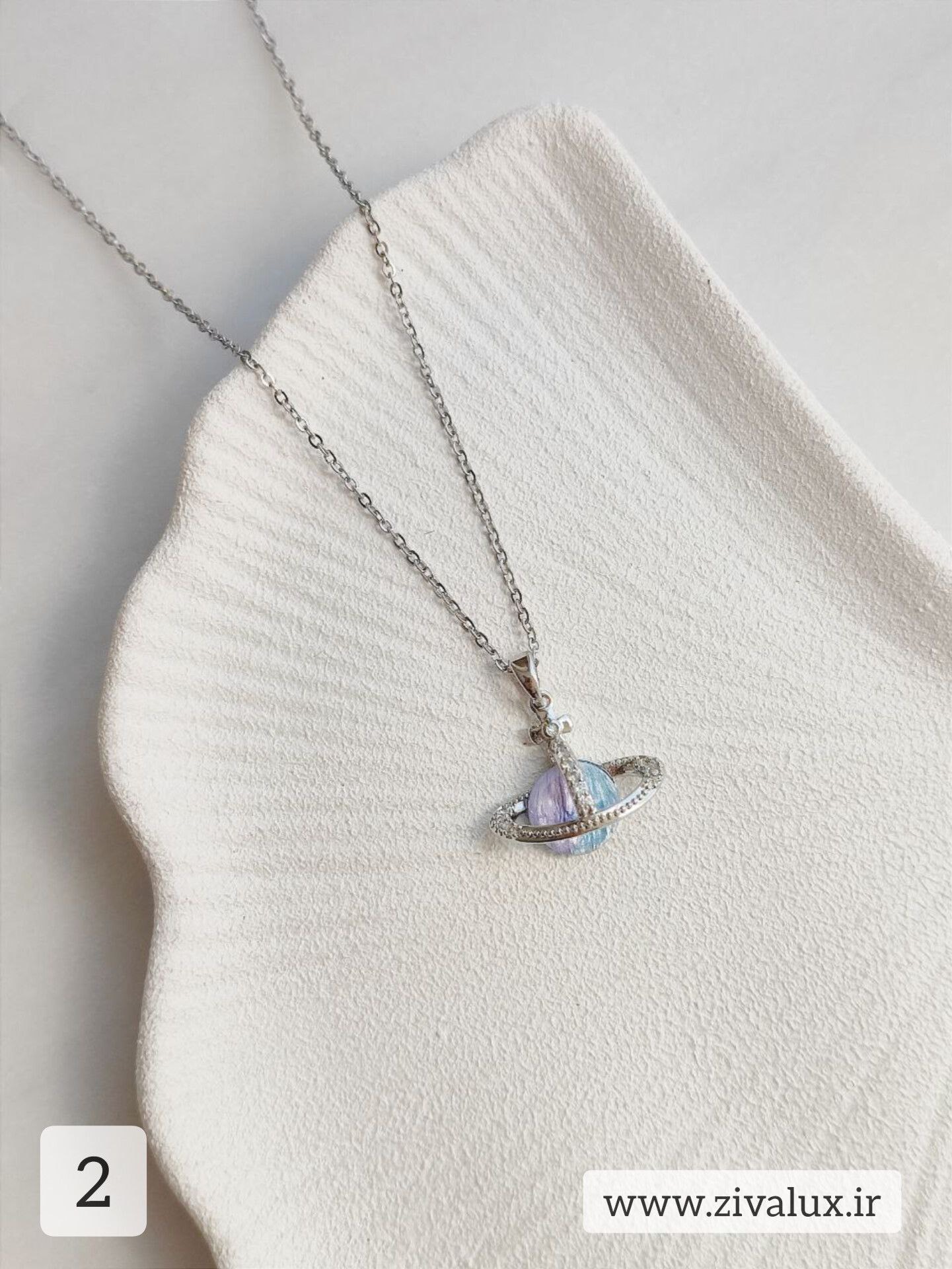 حلقهی دور سیاره با نگینهای ریز تزیین شده و انگار هر بار که تکون میخوری، یه کهکشان کوچیک روی گردنت شروع به درخشیدن میکنه! ✨🌙