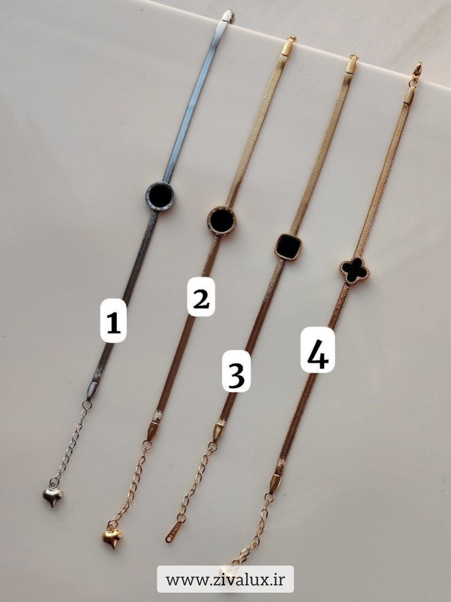 این مدلها با بند ماری انعطافپذیر و پلاکهای مشکی براق (دایرهای، مربعی و شبدر) طراحی شدهاند تا بهراحتی با انواع استایل—از اسپرت تا رسمی—ست شوند. سادگی شیک که هیچوقت از مُد نمیافتد ✨
