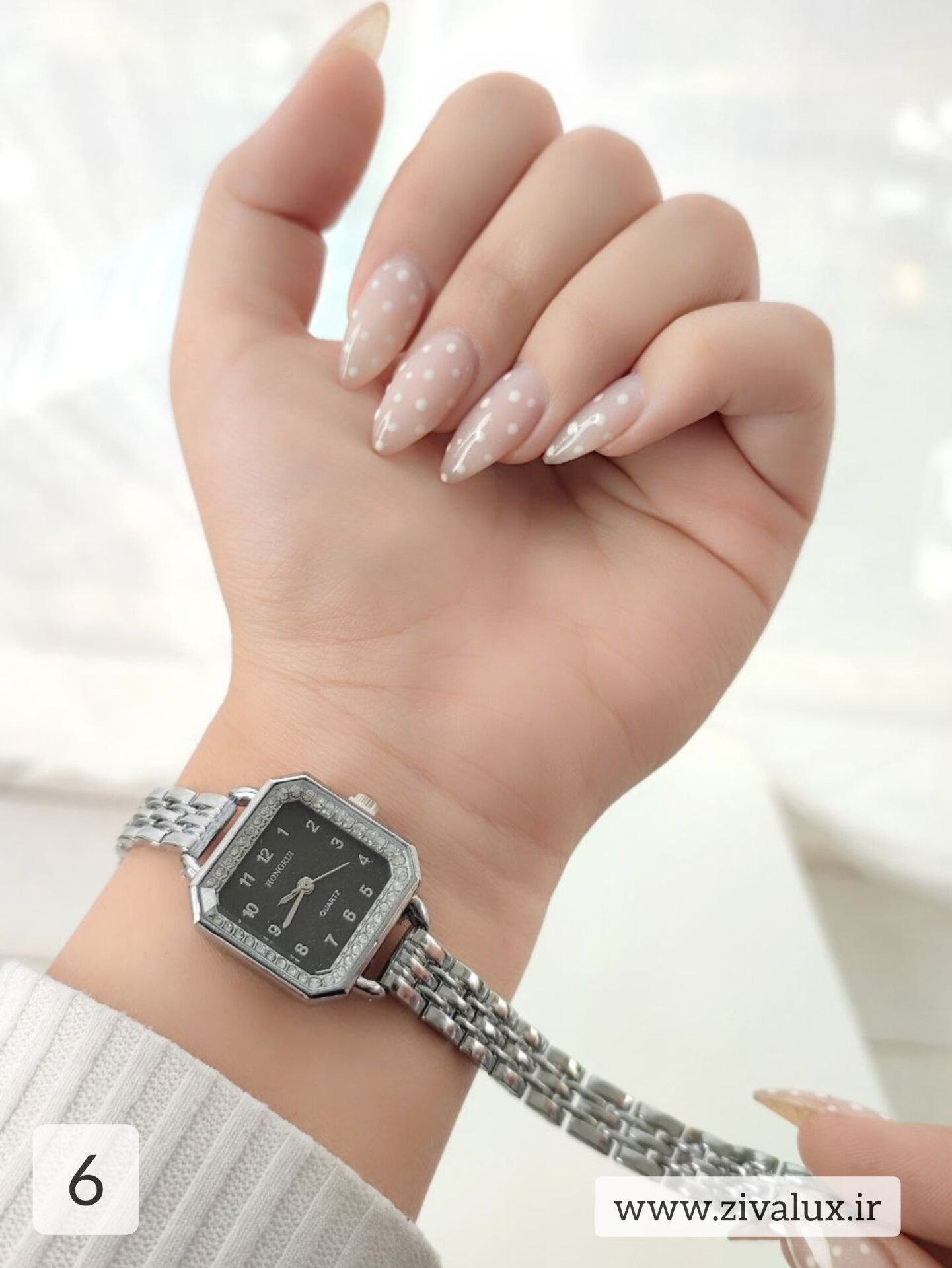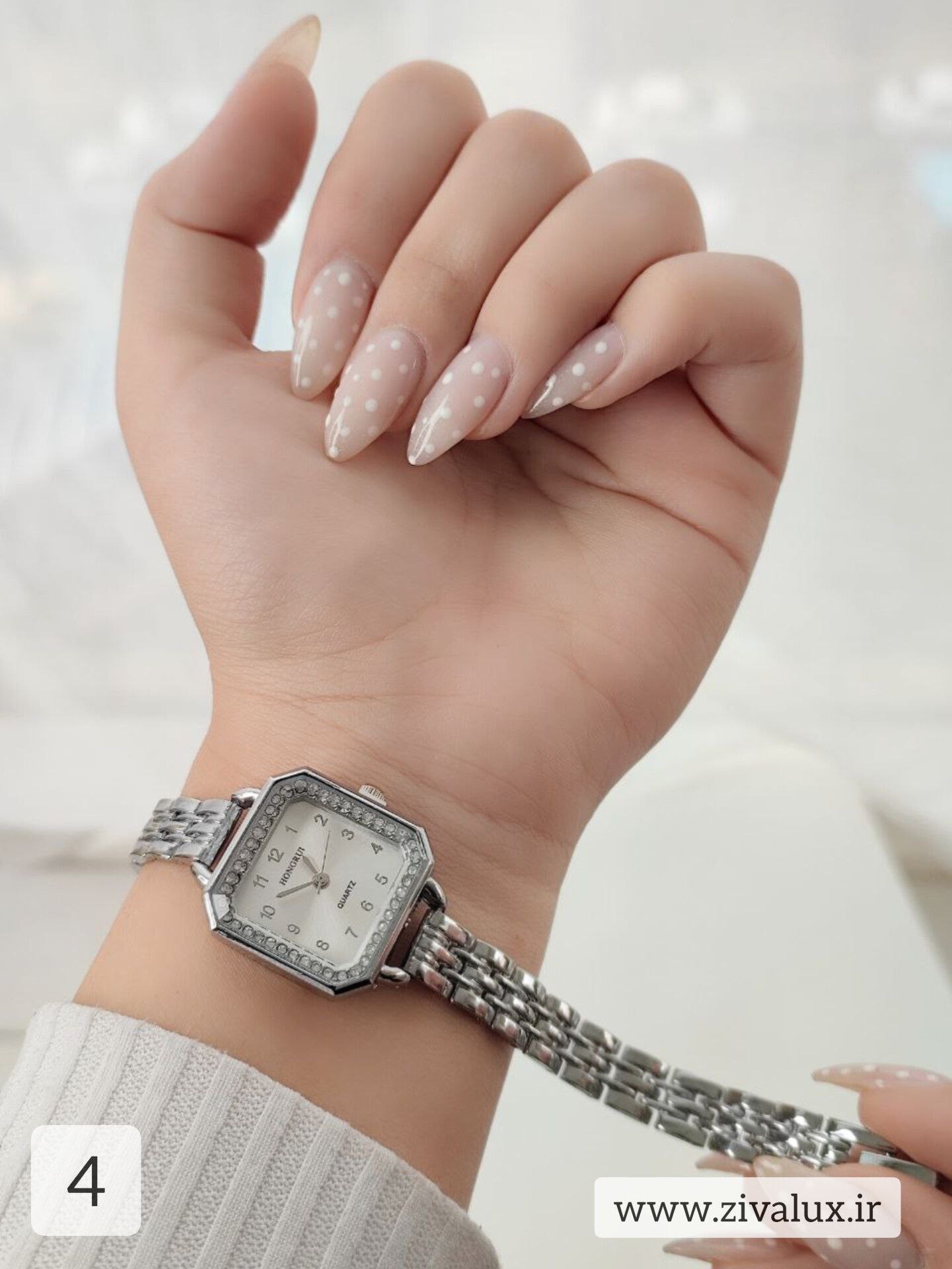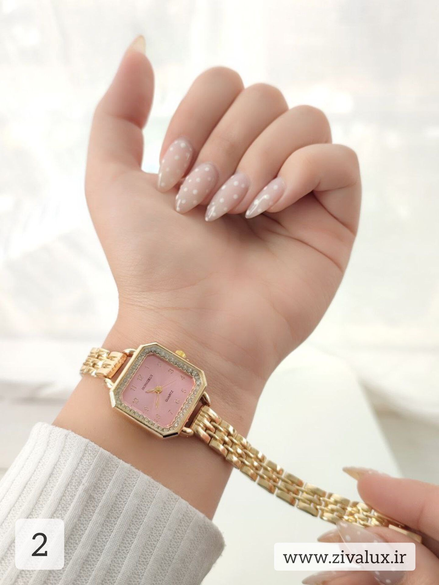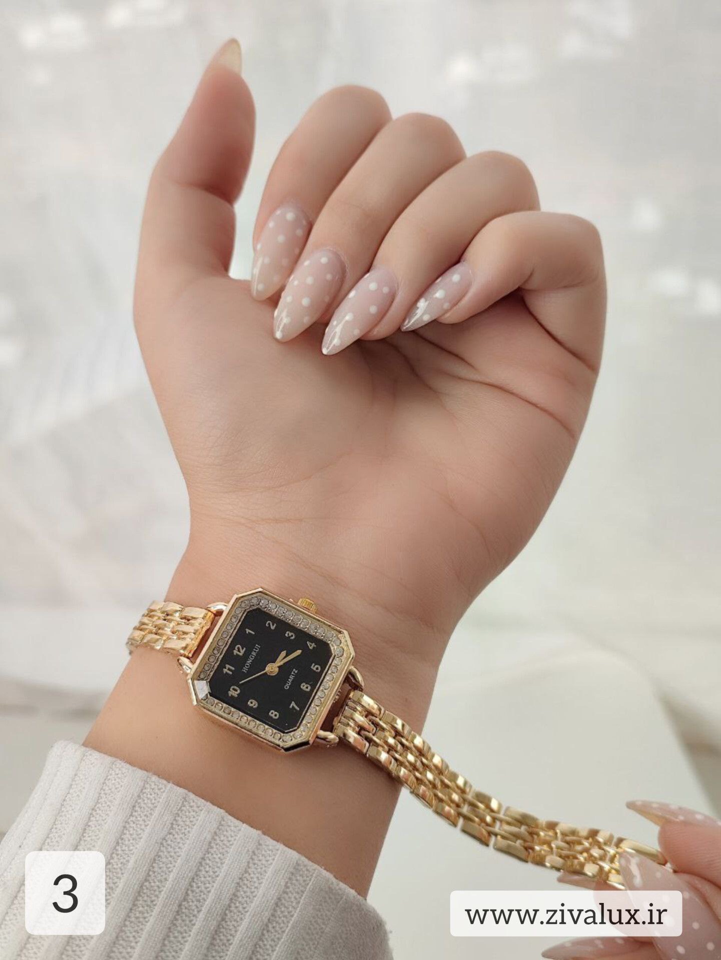 اولین چیزی که در این ساعت جلب توجه میکند، نگینکاری ظریف دور قاب است که جلوهای شیک و لاکچری به آن بخشیده است. طراحی چهارگوش قاب، حس کلاسیک و در عین حال مدرن را به استایل شما اضافه میکند ✨👑