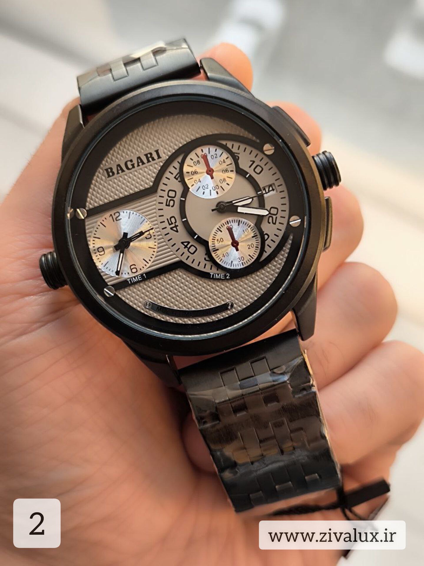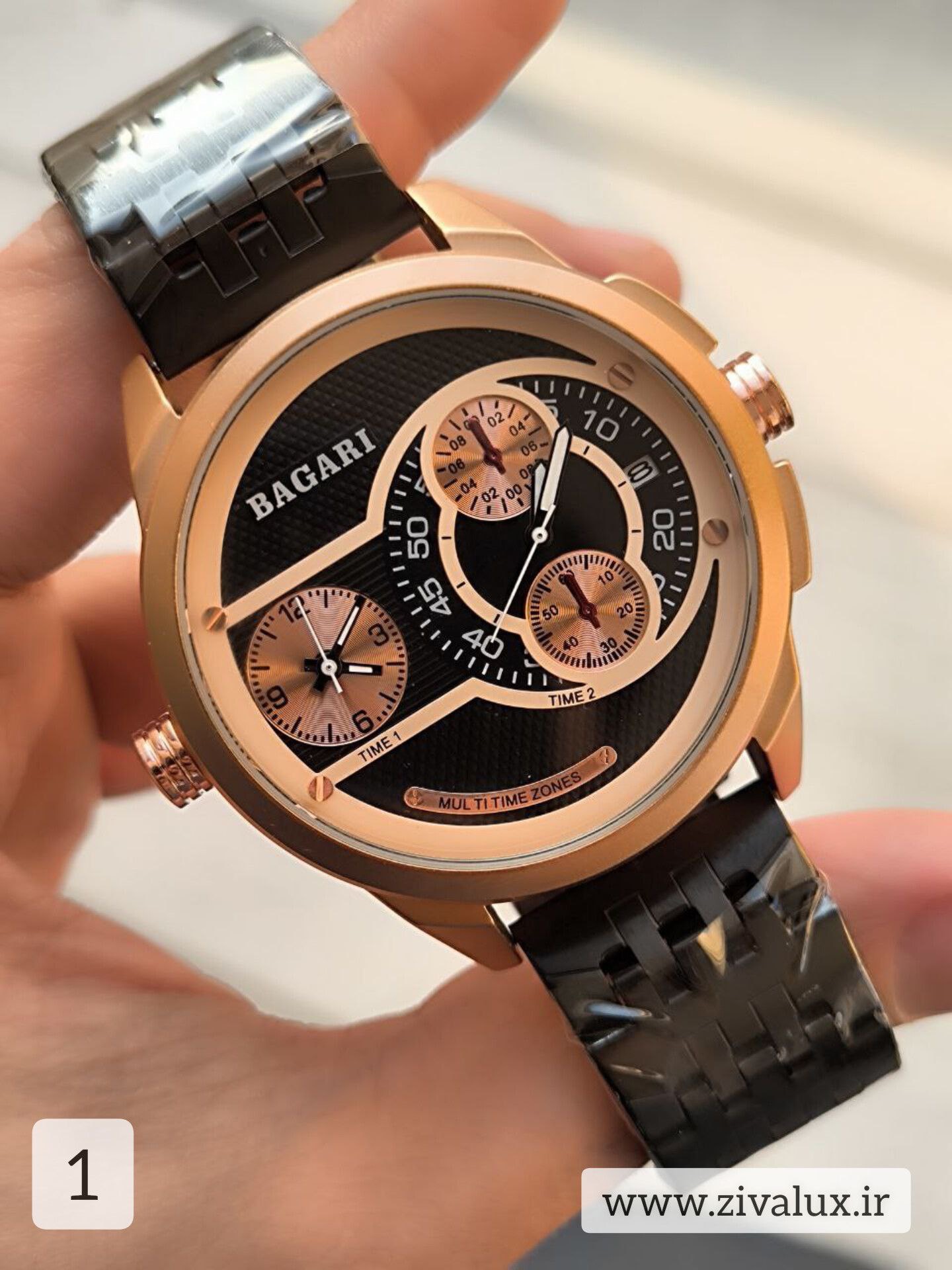در همان نگاه اول، طراحی قدرتمند و خاص BAGARI 1812 توجه را جلب میکند. صفحه چند لایه با جزئیات دقیق و ترکیب رنگهای جذاب، این ساعت را به یک اکسسوری کاملاً چشمگیر تبدیل کرده است 👔🔥