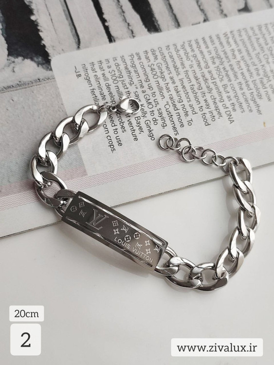 🔗 زنجیر ضخیم و خوشفرم در کنار پلاک مستطیلی LV با جزئیات ظریف، باعث شده این مدل روی دست کاملاً دیده بشه و حس قدرت و اعتمادبهنفس رو منتقل کنه 💫