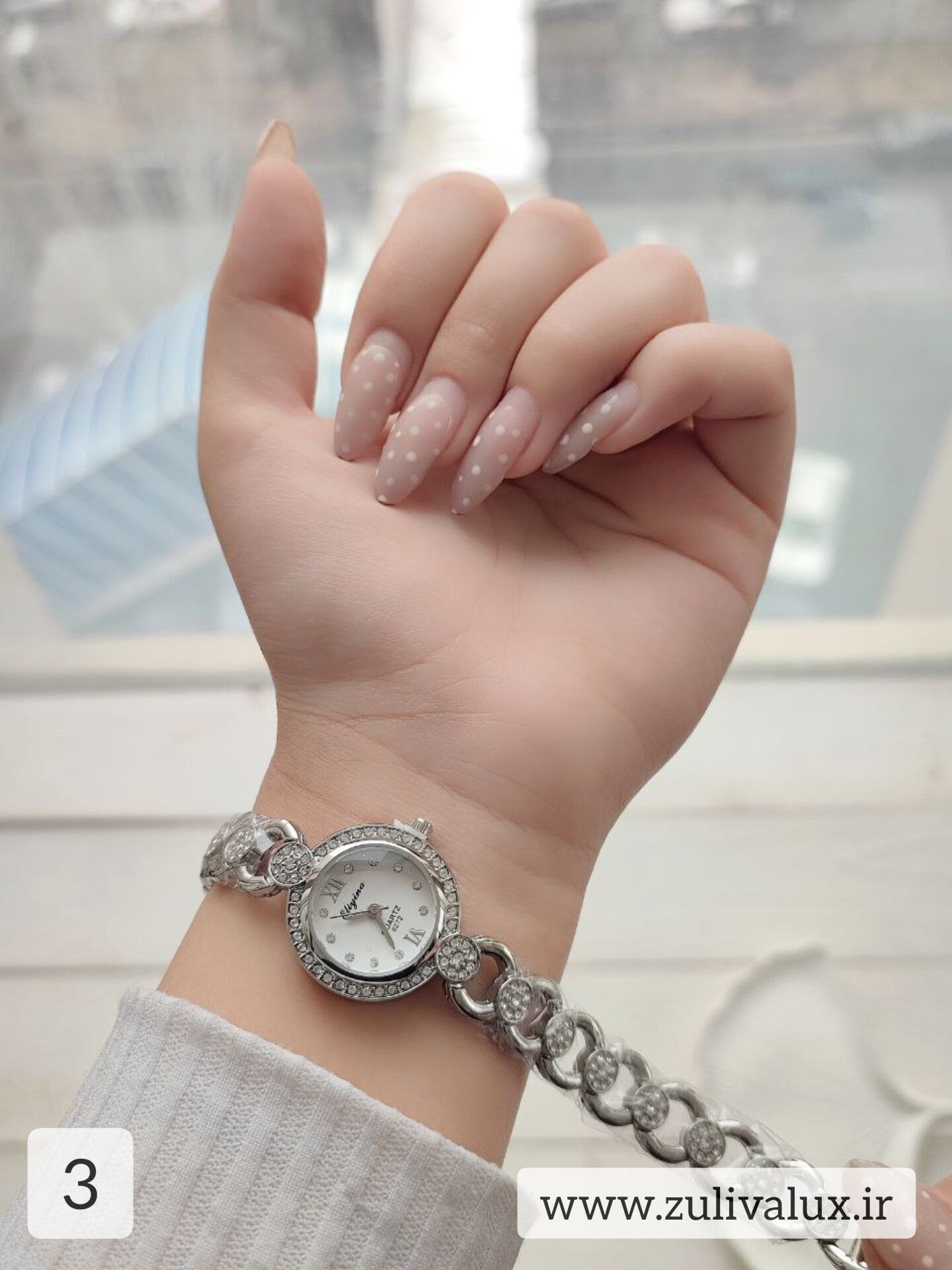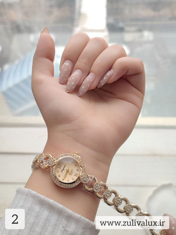 نگینکاری ظریف در کنار اعداد نگینی، جلوهای لوکس و زنانه به ساعت بخشیده است.
