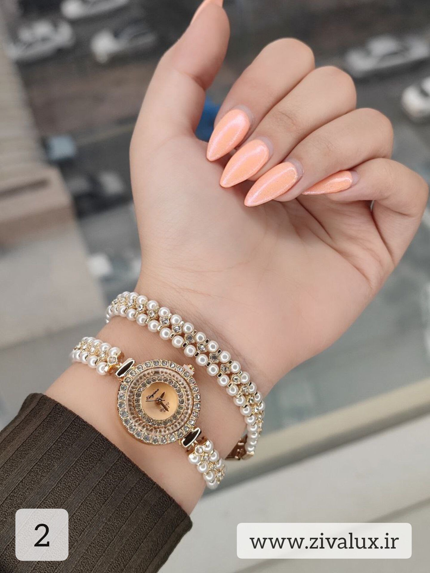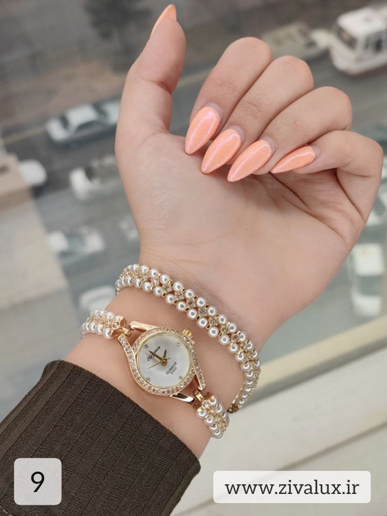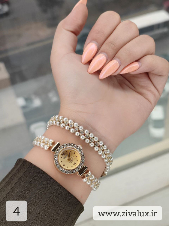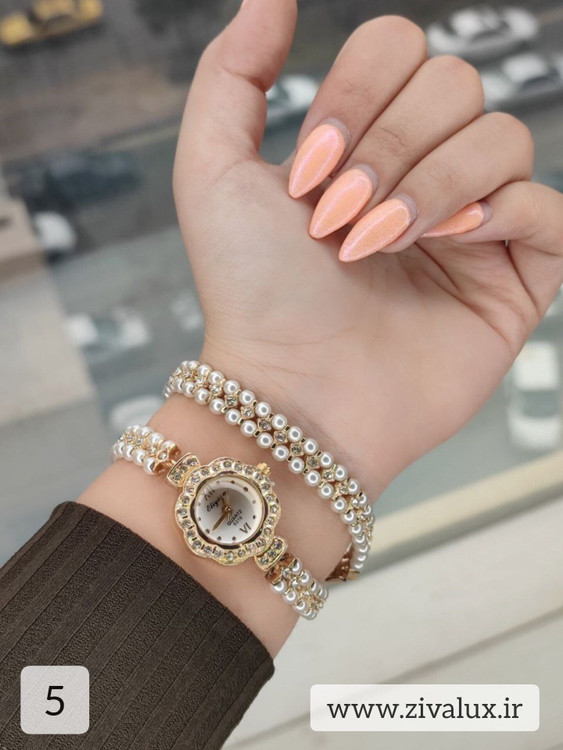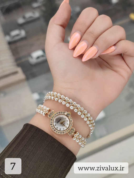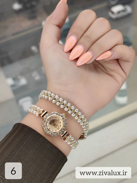 طراحی دو دور این مدل باعث میشود مرواریدها بهزیبایی دور مچ قرار بگیرند و جلوهای ظریف، زنانه و بسیار شیک ایجاد کنند. ترکیب قاب فلزی براق با بند مرواریدی، حس لطافت و وقار را همزمان منتقل میکند 👑💫